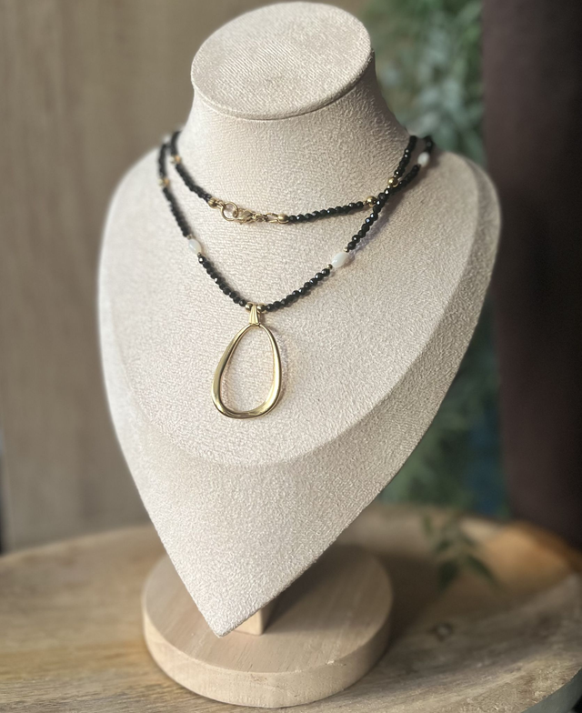 Il est composé de pierres naturelles teintées noires et d’un pendentif asymétrique, pour un effet sophistiqué et contemporain.